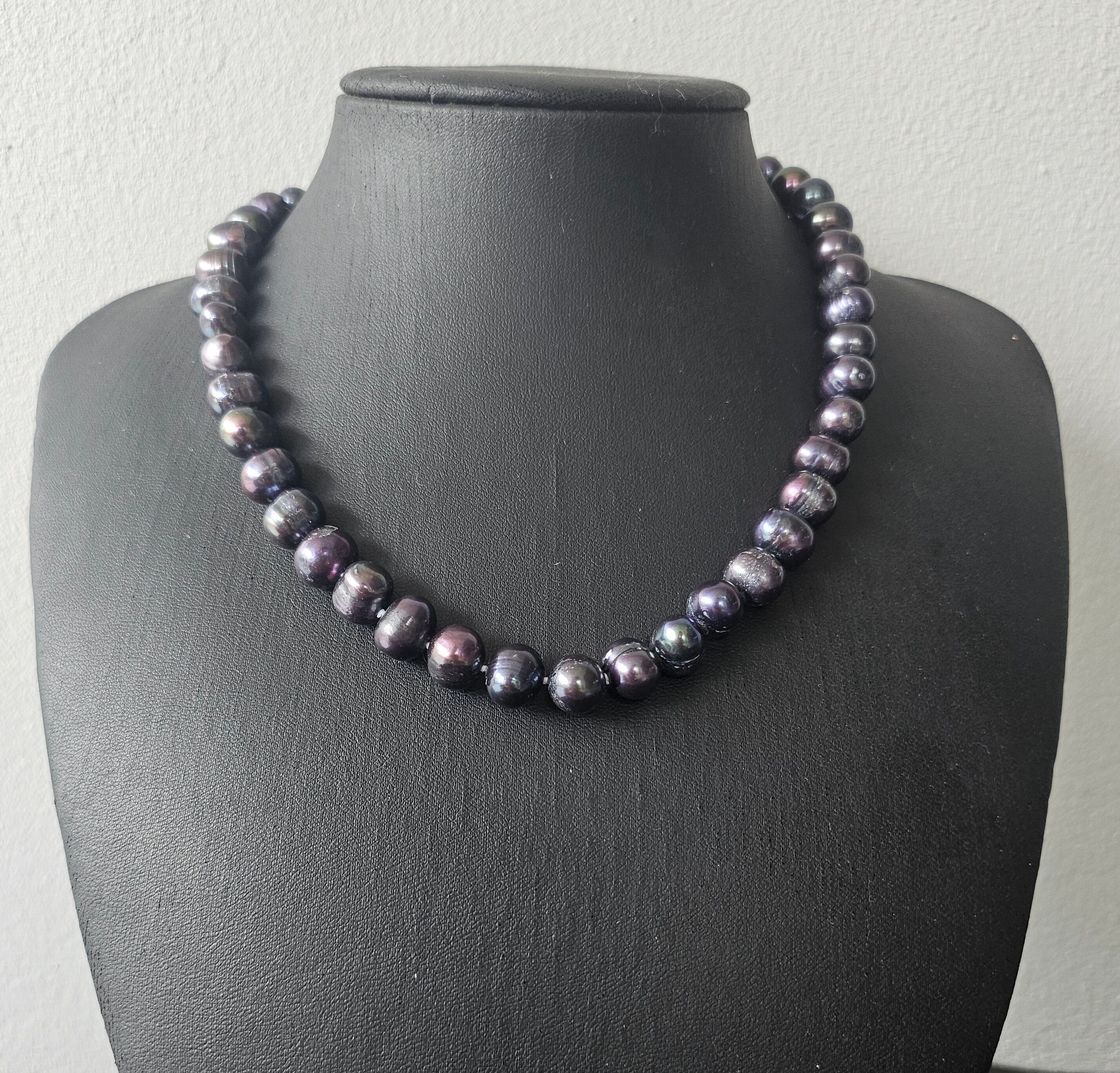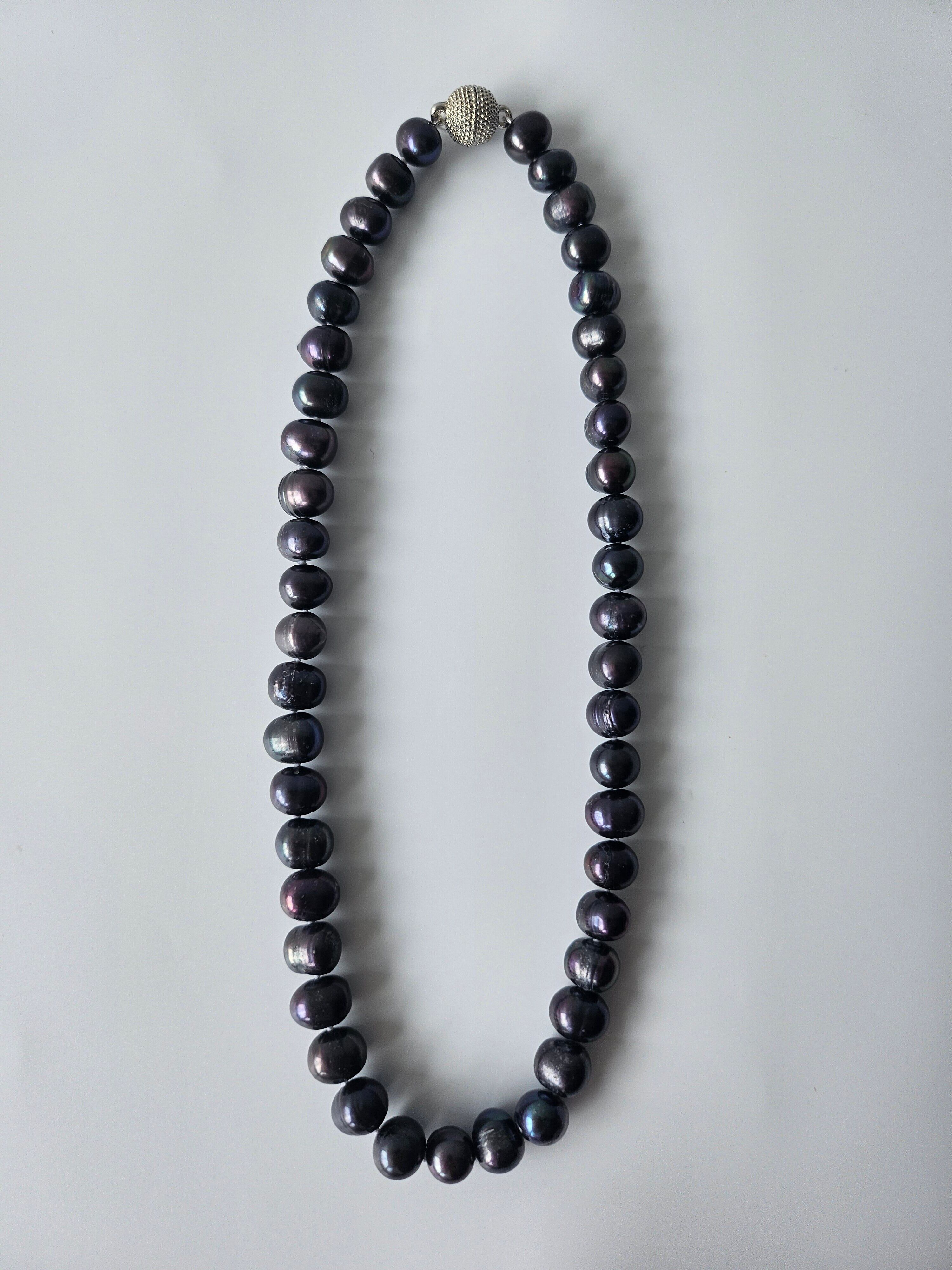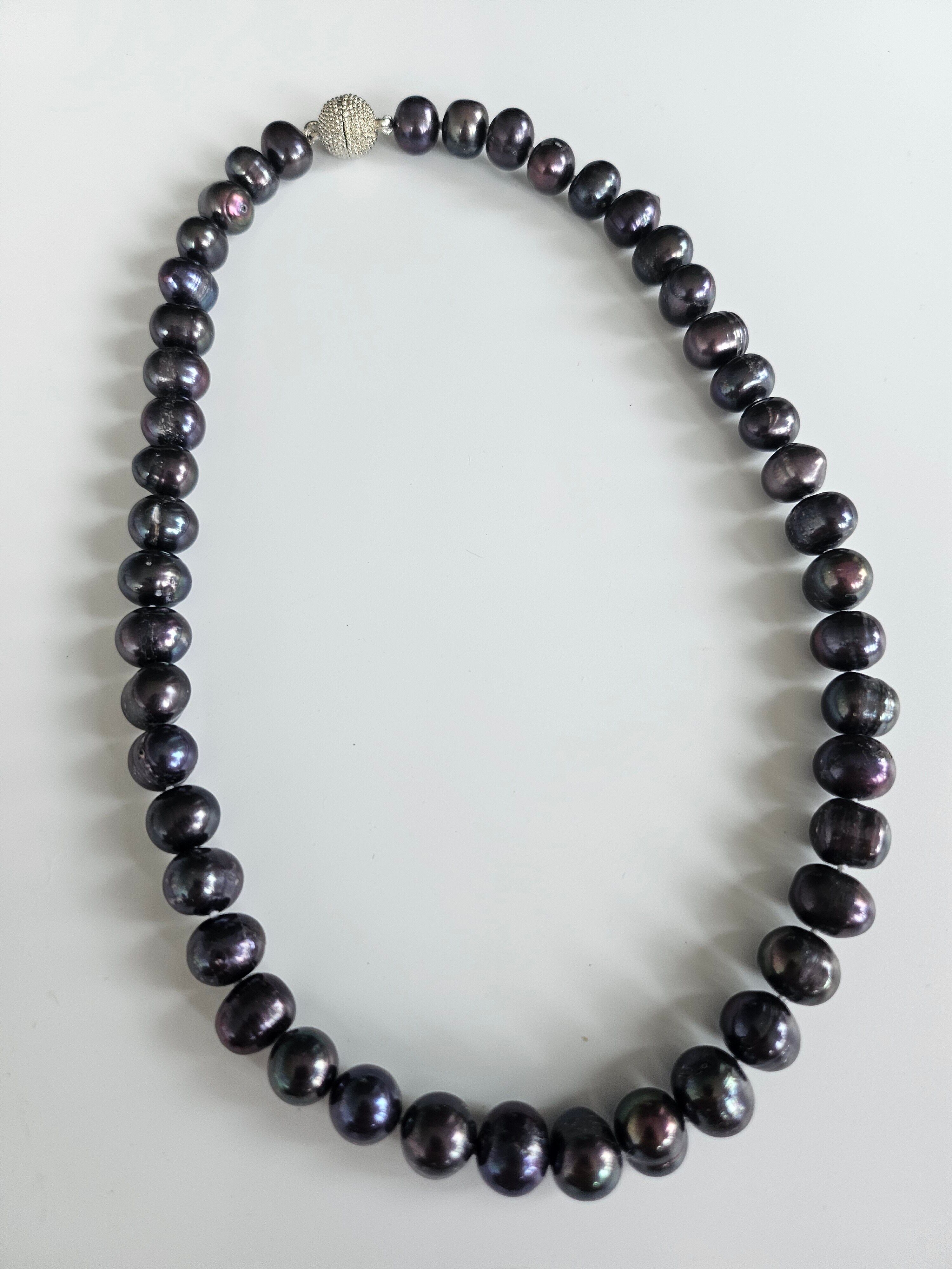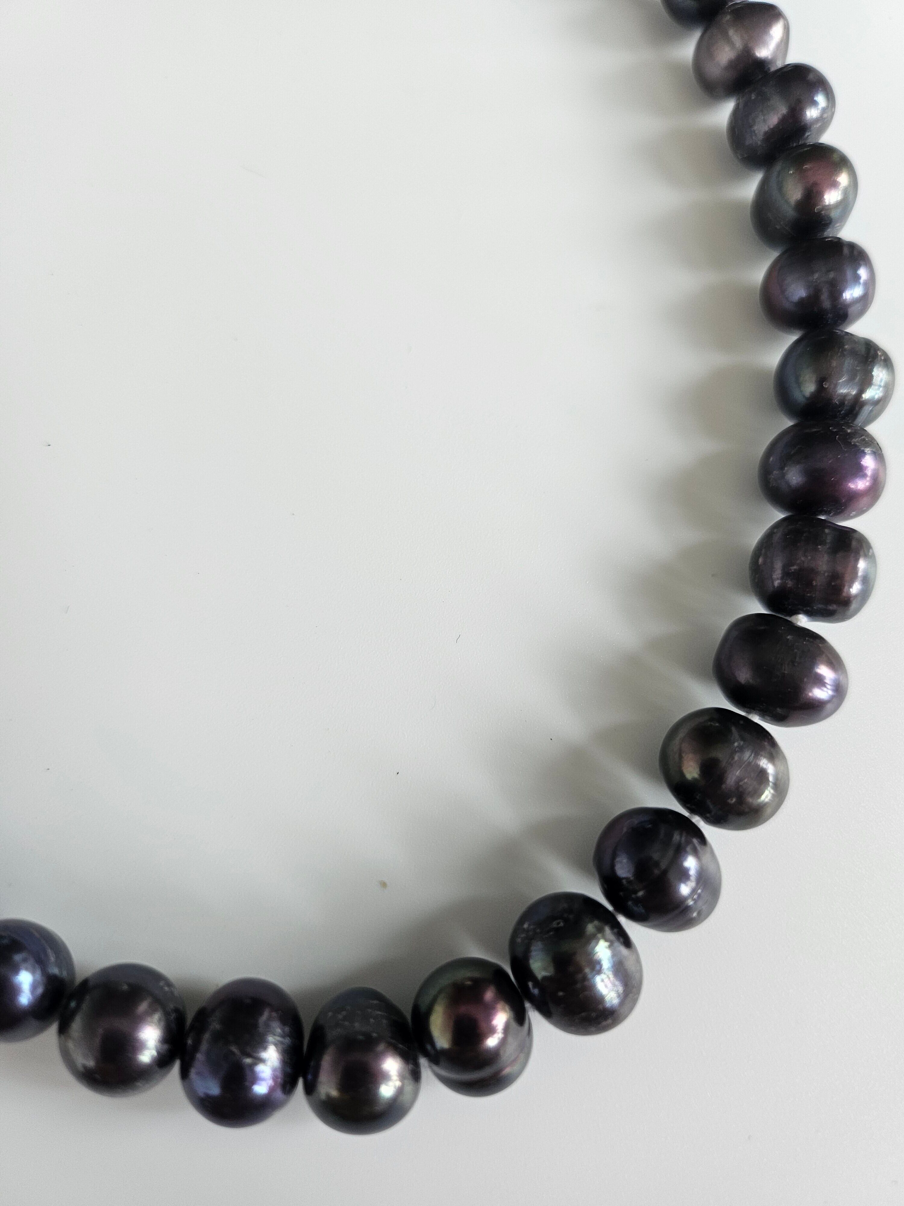 南洋真珠は、南半球の温暖な海域で育つ、大粒で豊かな光沢を持つ真珠の総称です。特に、このネックレスに使用されている黒系の真珠は、その深みとメタリックな輝きから「真珠の女王」とも呼ばれています。